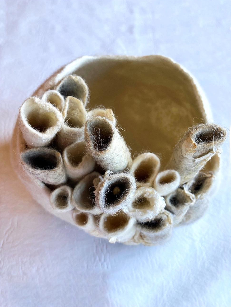 Técnica: Fieltro humedo, lana Merino, papel de morera, bolsitas de té y fibras de cañamo.