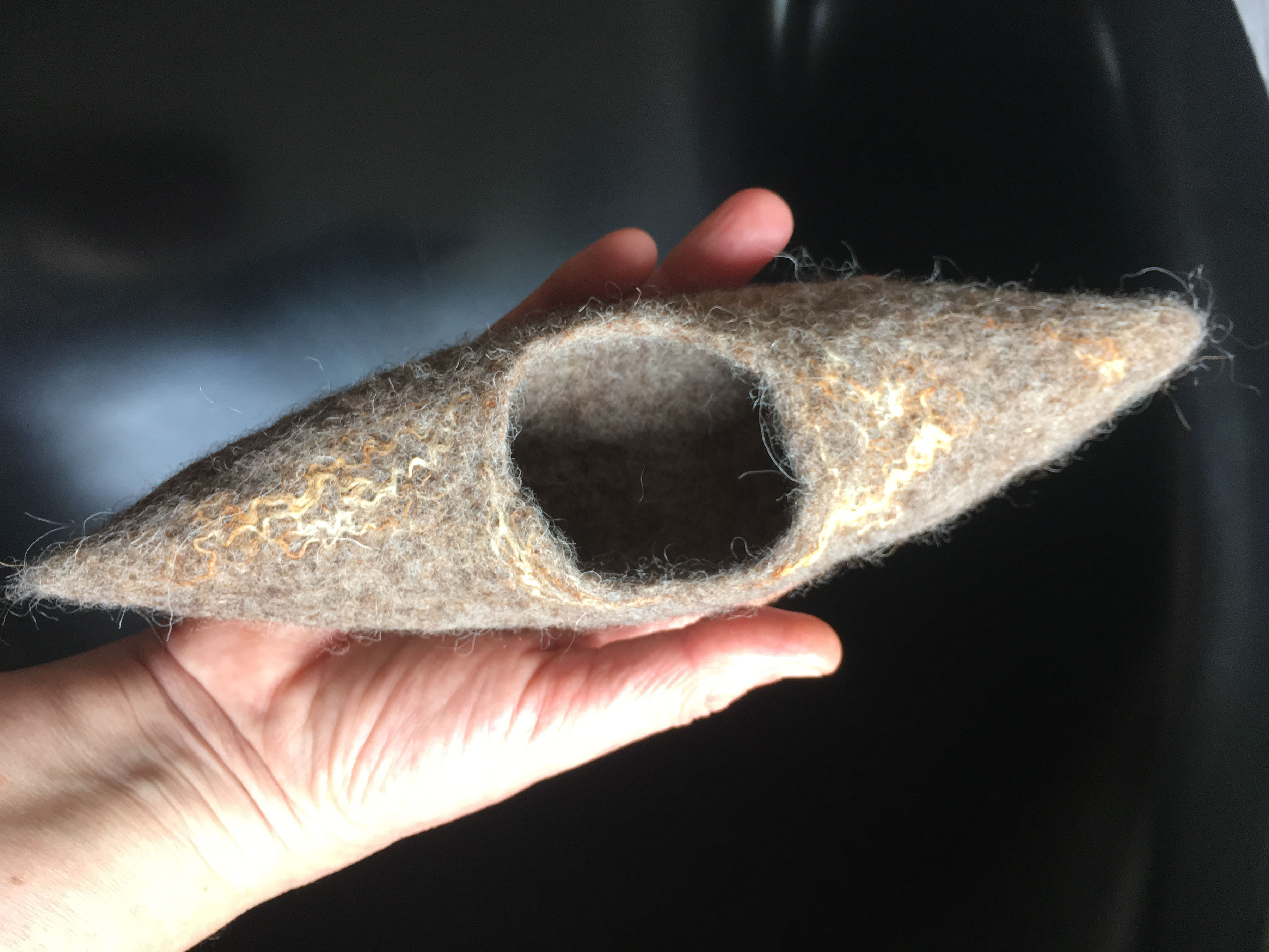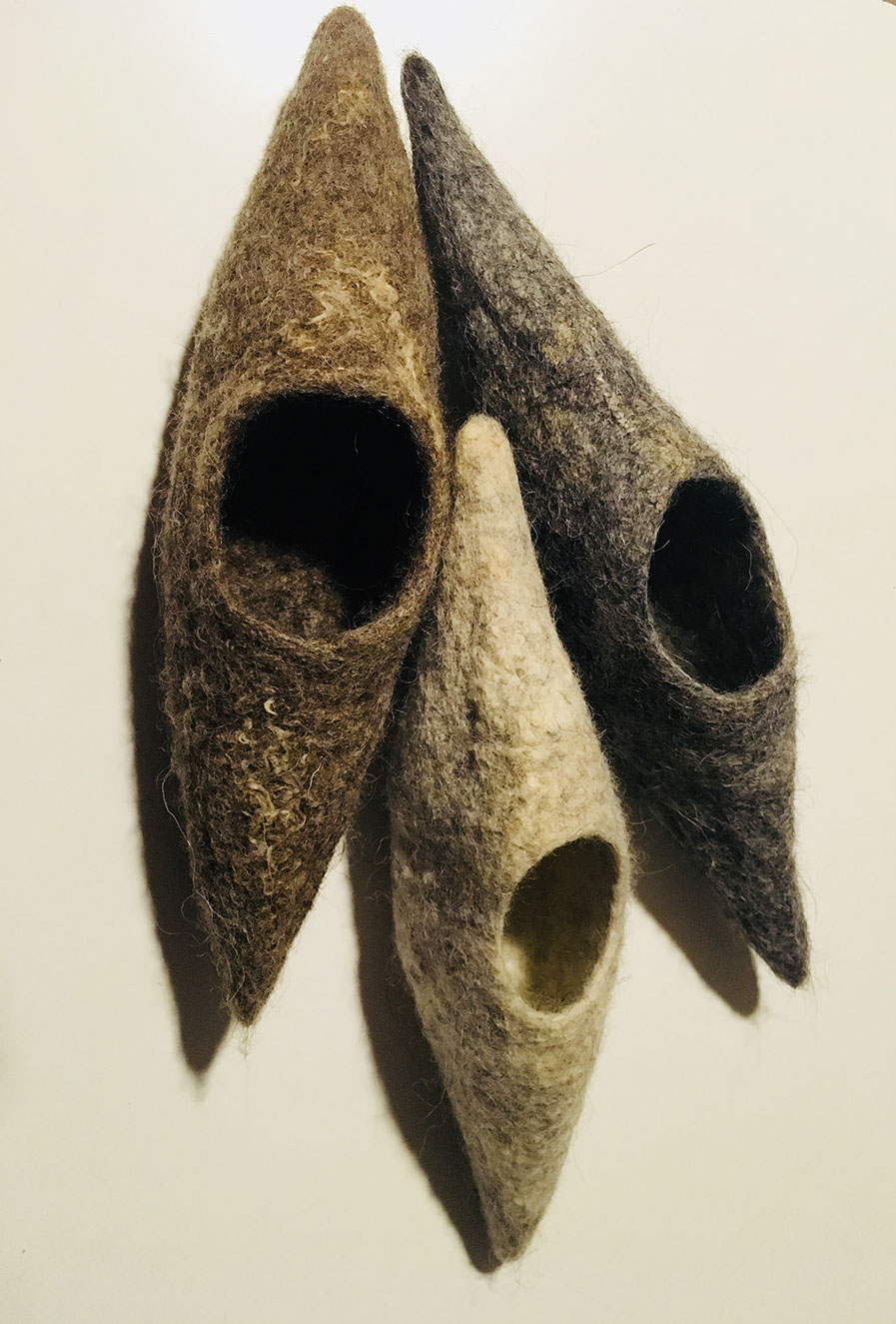 Técnica: Fieltro húmedo, lana Corriedale, fibras de bambú, restos de hilos del algodón.