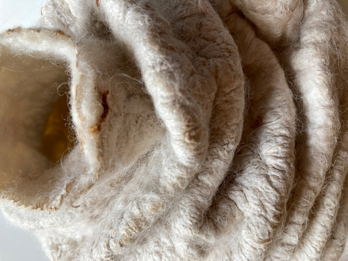 Técnica:Fieltro húmedo, lana Merino , papel de morera , hilos de algodón oxidados con metales del mar